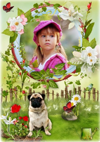 Цветочная рамка для фото с собачкой мопс - Чудесный летний день :
